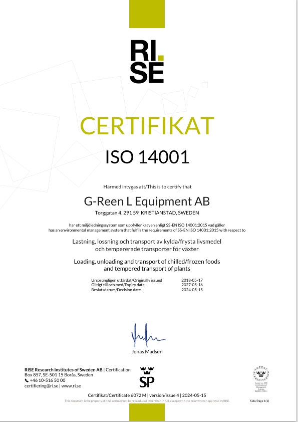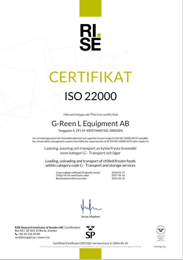 Green L Equipment AB har ett ledningssystem för livsmedelssäkerhet som uppfyller kraven enligt SS-EN ISO 22000:2005 vad gäller: lastning, lossning och transport av kylda/frysta livsmedel.